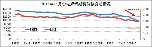 期貨市場方面:截至11月24日,滬鋁三月結算跌至9670元,自跌破萬元大關以來,滬鋁主力合約日均漲跌幅為1.4%-2.1%;LME鋁三月結算跌至1446美元,其跌幅自今年8月以來開始低于滬鋁跌幅。研究認為,滬鋁三月與LME鋁三月結算價將逐步筑底于9600元關口(Min.值),期鋁價格將迎來較大的反彈空間。