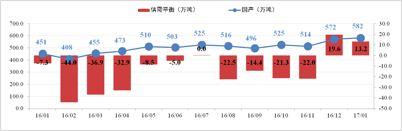 供給方面:2月10日,全國電解鋁有效產能為4,226.6萬噸,運行產能37萬37.5噸,開工率為88.42%。其中,1月份電解鋁總產量為299.6萬噸,供應持續增加。調研數據顯示,2017年電解鋁新產能已投產98.1萬噸,預計年度最終實現588.5萬噸;電解鋁復產21.2萬噸,預計年內最終實現152萬噸。