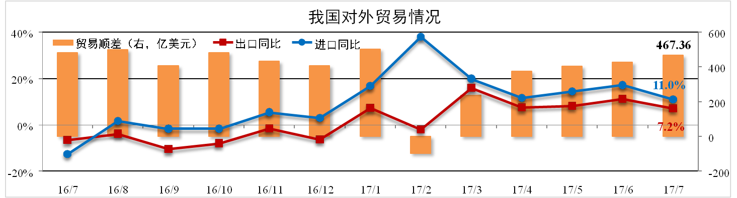 據(jù)海關(guān)總署數(shù)據(jù),7月份我國進(jìn)出口總值3405.55億美元,同比增長8.8%。 其中出口1936.46億美元,同比增長7.2%;進(jìn)口1469.09億美元,同比增長11.0%; 貿(mào)易順差為467.36億美元,環(huán)比上漲9.3%。