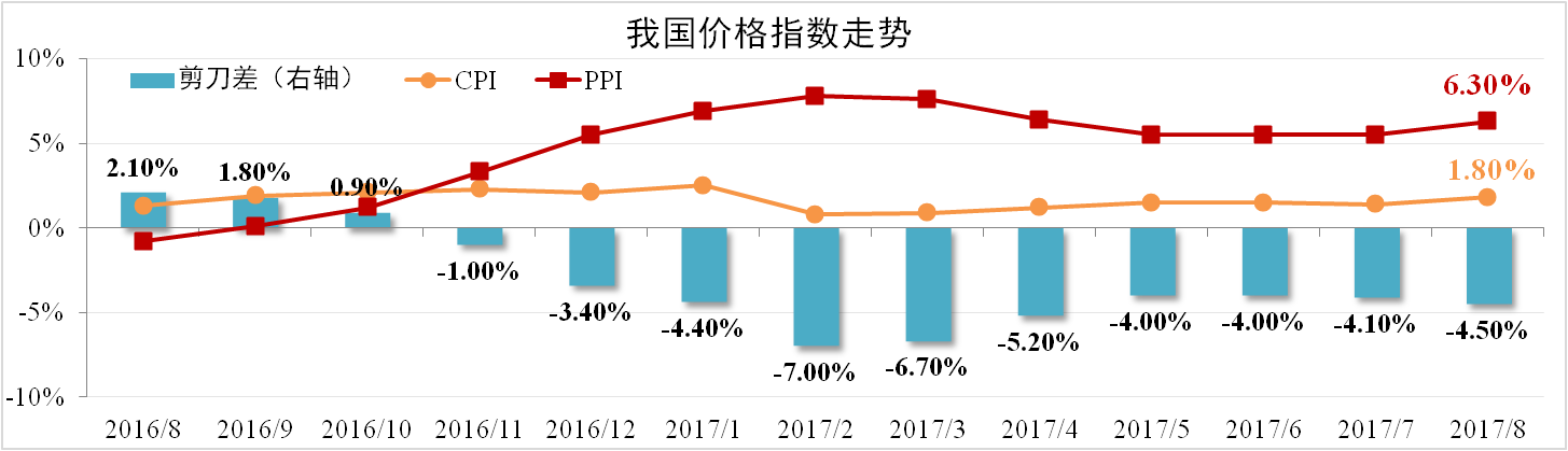 8月份CPI與PPI雙雙超預期回升。據國家統計局數據,8月份CPI為1.8%,PPI為6.3%,分別較上月擴大0.8、0.4個百分點。夏季極端天氣增多導致鮮菜及肉類價格上漲是CPI上升的主要原因。剪刀差較上月擴大0.4個百分點至-4.5%。