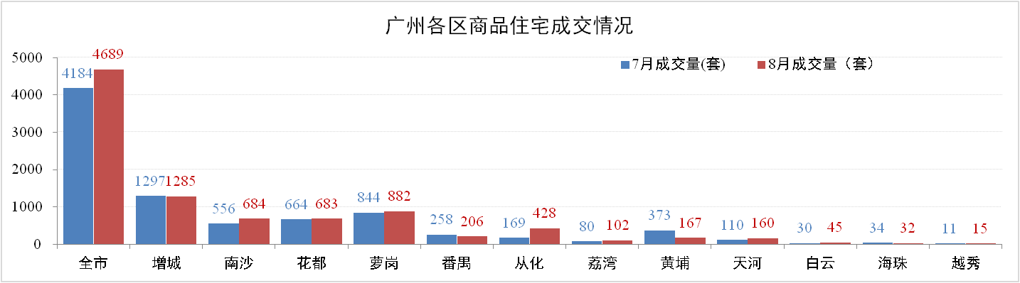 成交量方面:8月廣州市住宅成交有所回暖,但仍維持在歷史低位水平,成交主要在增城、花都、南沙和蘿崗四區。其中,增城區一手商品住宅網簽1,285套,環比下降0.93%。
