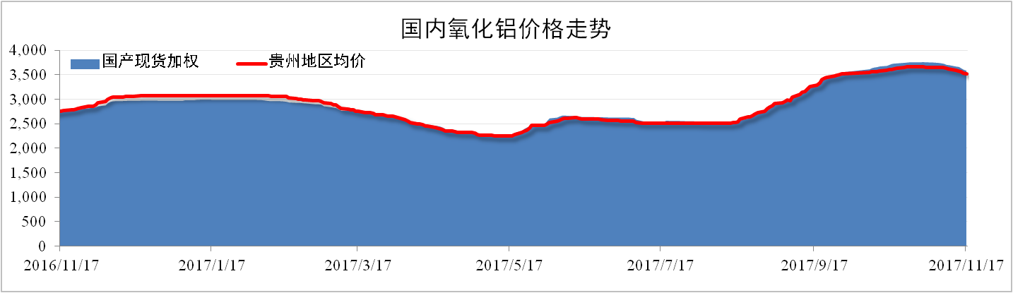 截止11月17日,國(guó)產(chǎn)氧化鋁現(xiàn)貨加權(quán)均價(jià)為3,582元/噸,環(huán)比下降3.20%。貴州地區(qū)氧化鋁現(xiàn)貨加權(quán)均價(jià)為3,520元/噸,環(huán)比下降2.97%。受雙節(jié)影響,10月氧化鋁市場(chǎng)參與度、市場(chǎng)熱度較前期下降,氧化鋁價(jià)格上漲明顯收窄。