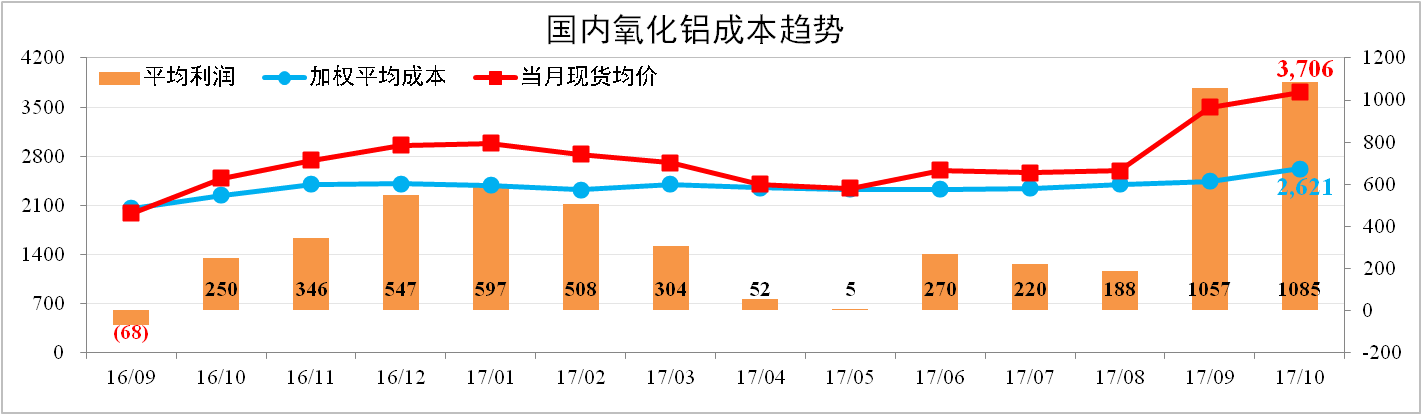 10月份煤炭、鋁土礦及燒堿價(jià)格繼續(xù)上漲,導(dǎo)致氧化鋁成本增加。國(guó)內(nèi)氧化鋁行業(yè)加權(quán)平均成本漲至2,621元/噸,環(huán)比上漲7.29%。全國(guó)氧化鋁現(xiàn)貨成交均價(jià)達(dá)到3,706元/噸。理論上,氧化鋁行業(yè)平均利潤(rùn)水平約1,085元/噸。