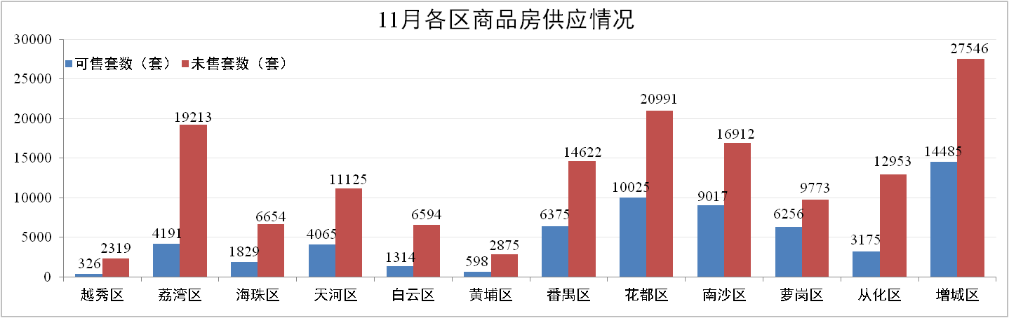11月30日,廣州市新建住宅商品房供應共151,577套,環比上升7.6%,其中:可售住宅商品房為61,656套,占比40.68%。花都、增城、番禺、南沙仍保持最高供應量,可售和未售房源累計占全市比例分別為64.72%和52.83% 。