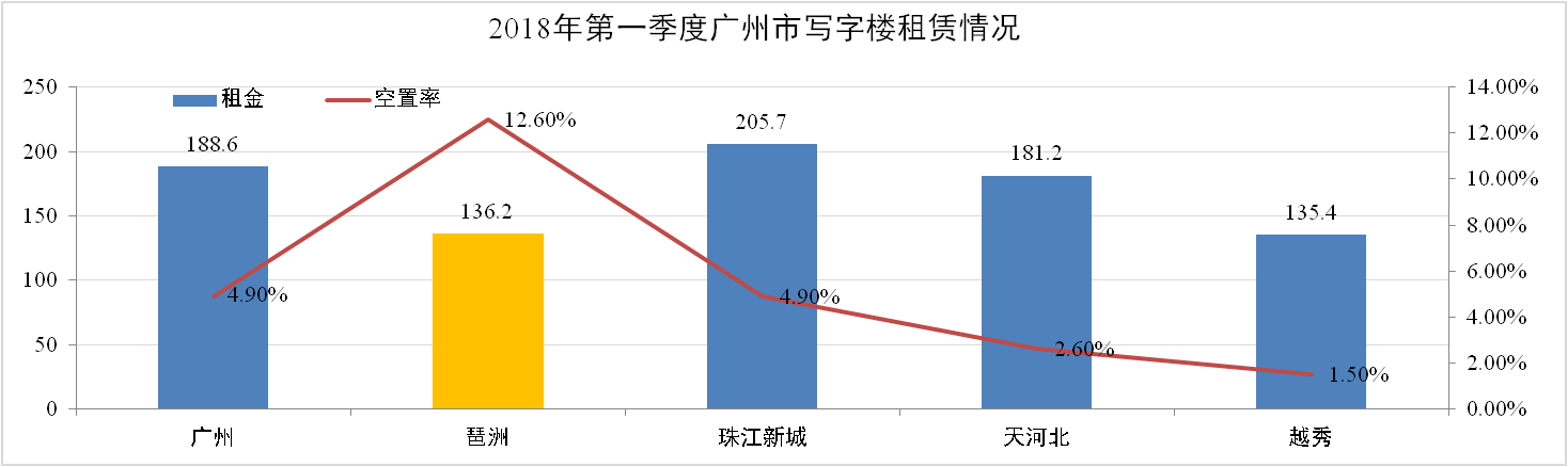 根據戴德梁行《2018年廣州市第一季度寫字樓速遞》報告,2018第一季度廣州市甲級寫字樓租金為188.6元/㎡/月,環比上升3.9%;琶洲市場平均租金136.2元/㎡/月,環比上升4.9%。全市空置率為4.9%,琶洲空置率為12.6%。