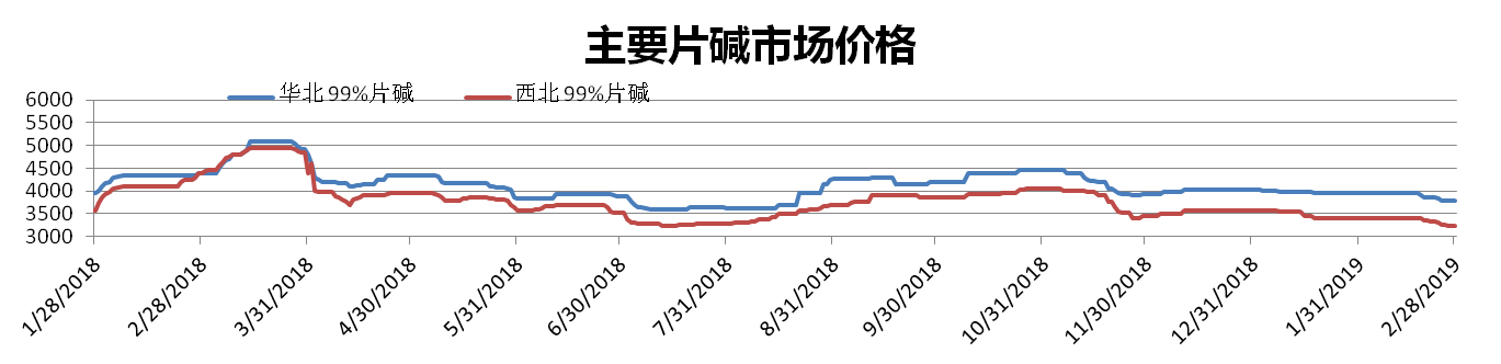 2月份國內片堿的總體成交有所下降,市場整體走勢繼續(xù)下行。截止到2月28日,西北99%片堿市場價為3225元/噸,環(huán)比下降3.42%;華北99%片堿市場價為3775元/噸,環(huán)比下降1.79%。